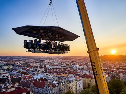 Pokud zrovna netrpíte akrofobií (strachem z výšek) máte letos v září v Praze u parku Mrázovka jedinečnou možnost vychutnat si vynikající večeři v čtyřicetimetrové výšce. Lunch in the Sky se otvírá vždy jen na pár dní v roce., Nad Prahou zakotvil jeřáb se speciálním stolem pro 22 hostů, který se tu bude zdržovat od 4. do 14. září 2025. Kreativní menu inspirované babím létem tentokrát připraví slovenský šéfkuchař Peter Slačka.